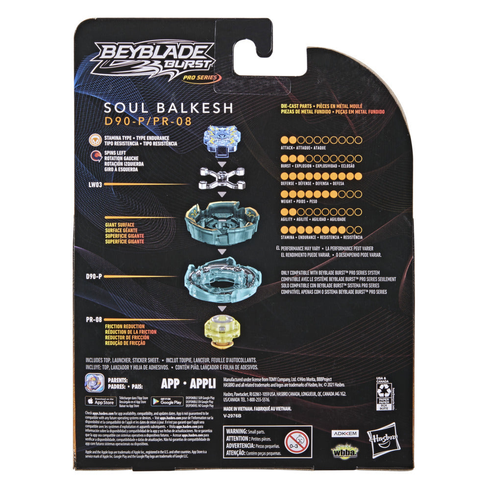 Includes 1 Beyblade Burst Pro Series left-spin launcher and 1 left-spin competitive battling top: Soul Balkesh D90-P PR-08. Top includes die-cast metal parts for a heavy weight and battle performance features for intense competitions. Soul Balkesh stamina type top features an Energy Layer with a giant surface and friction reduction in the Performance Tip. Top also includes a left-spin GT Chip and Layer Weight component.