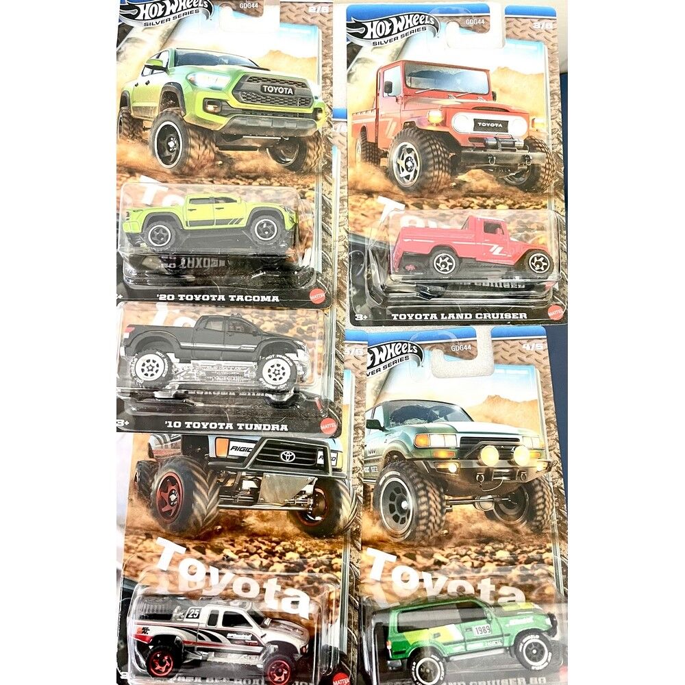 These are 1:64 scale die-cast cars from the 2025 Hot Wheels Silver Series Toyota set.