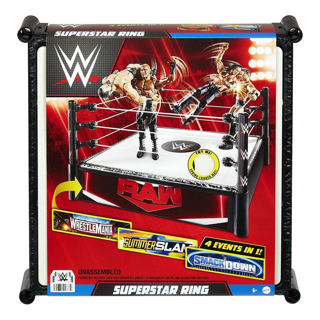 Recreate the in-ring action with the WWE Superstar Ring. This authentic 36cm (14-inch) ring features Pro-Tension Ropes for launching attacks and a Spring-Loaded Mat for extra bounce from slams. It's two events in one with RAW and Smackdown apron stickers. Play out matches with WWE Basic, Elite Collection, and Ultimate Edition action.